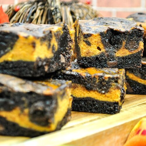 - Scoop the reserved brownie batter on top of the pumpkin topped brownies.