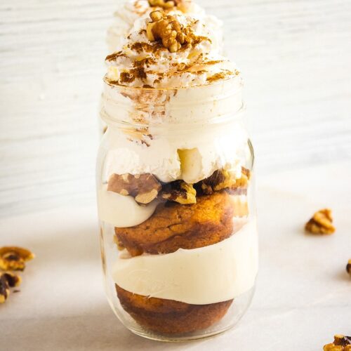 - In small mason jars or dessert dishes, layer a pumpkin cupcake (or half of a cupcake if using very small dishes/jars), followed by roughly ¼ cup cream cheese icing. Top with another cupcake, and then top that with the optional toppings of whipped cream, walnuts, and/or caramel sauce.