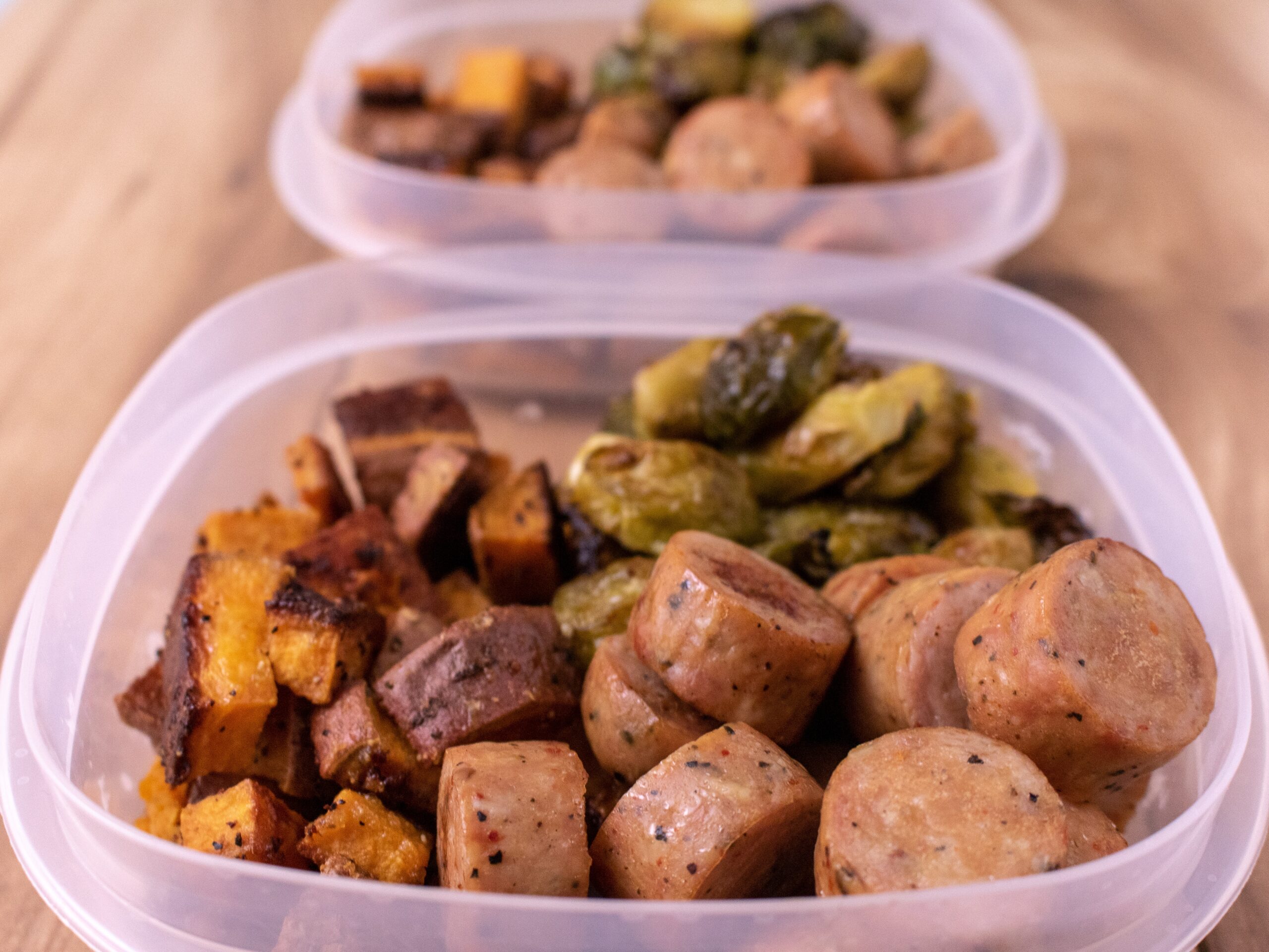 Chicken Sausage Meal Prep Bowls is a great sheet tray recipe for meal prep! With minimal prep these chicken sausage, brussels sprouts and sweet potato bowls can be a quick and easy hot lunch meal prep for the whole week on a few sheet trays in the oven.
