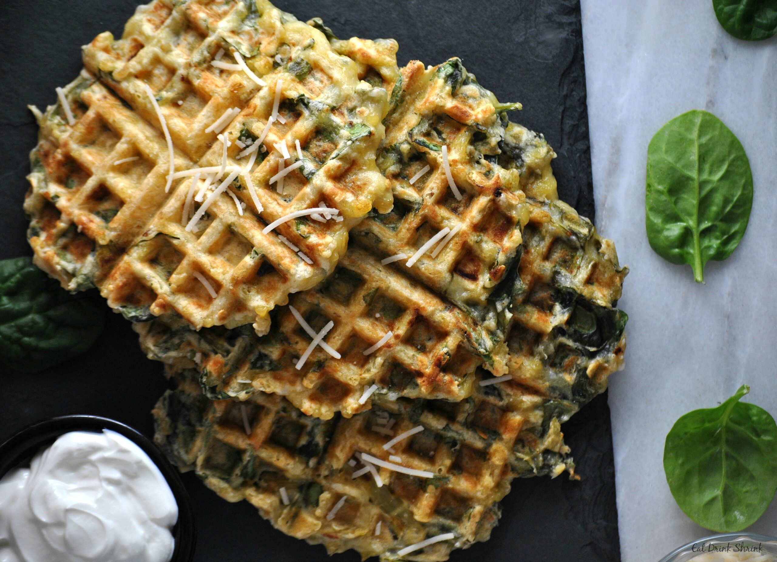 Spinach, peppers, basil, and scallions tucked in every inch of these savory veggie waffles. Who said that waffles are for breakfast only? Makes 5 large waffles.
